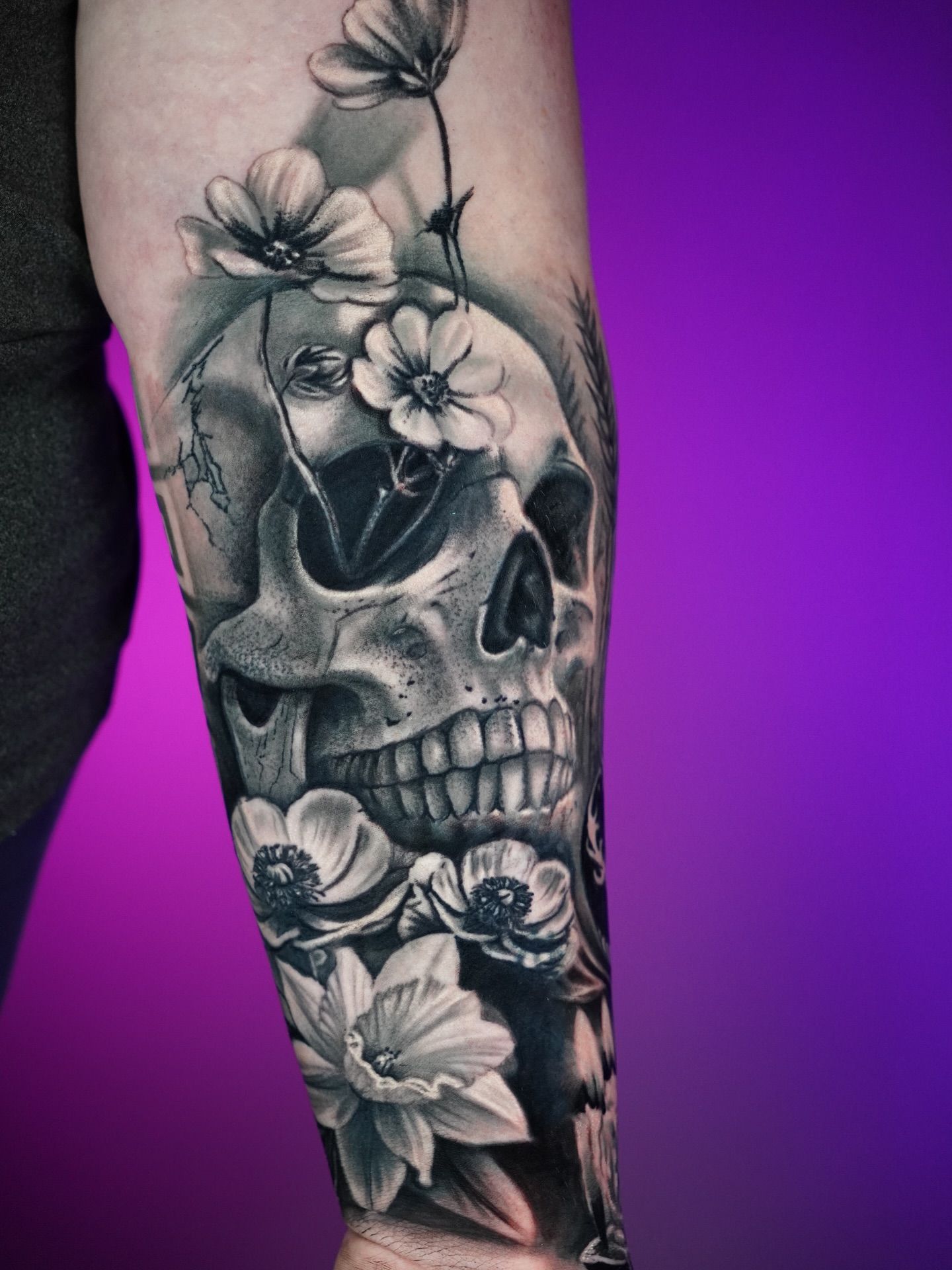 This is why I advocate for "structural contrast." Soft greys are the first to fade. If a portrait of a loved one or a detailed skull and flower piece is composed only of these delicate tones, the features will eventually disappear, leaving behind a faint, unidentifiable smudge. However, if the eyes of that portrait are anchored with deep, saturated blacks and the bone structure is defined by sharp value shifts, the "soul" of the image will endure.